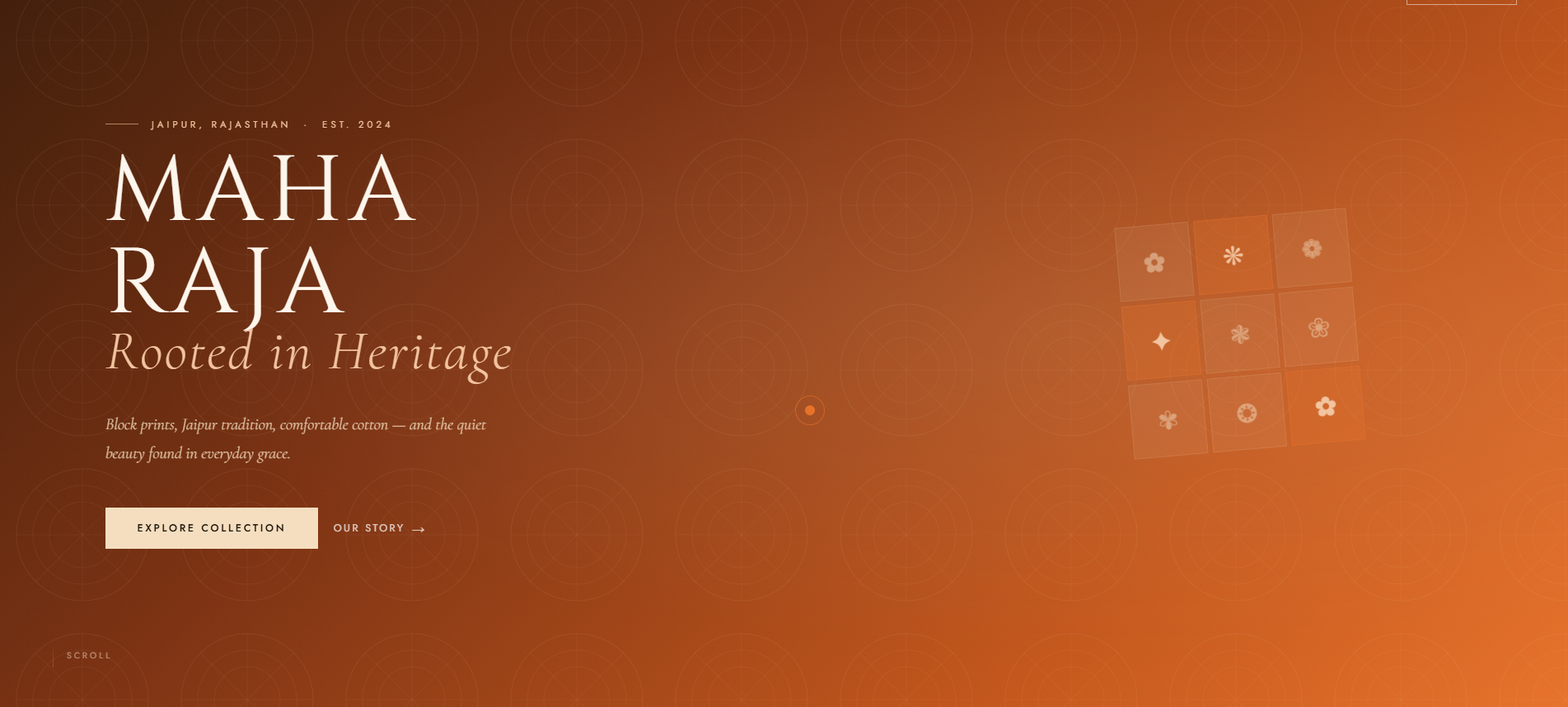 We exist because fast fashion has no memory. Maharaja was born to slow down — to honour the Chhipa community's 400-year-old block-printing heritage of Bagru Village, and stitch it into silhouettes a modern man can truly live in.